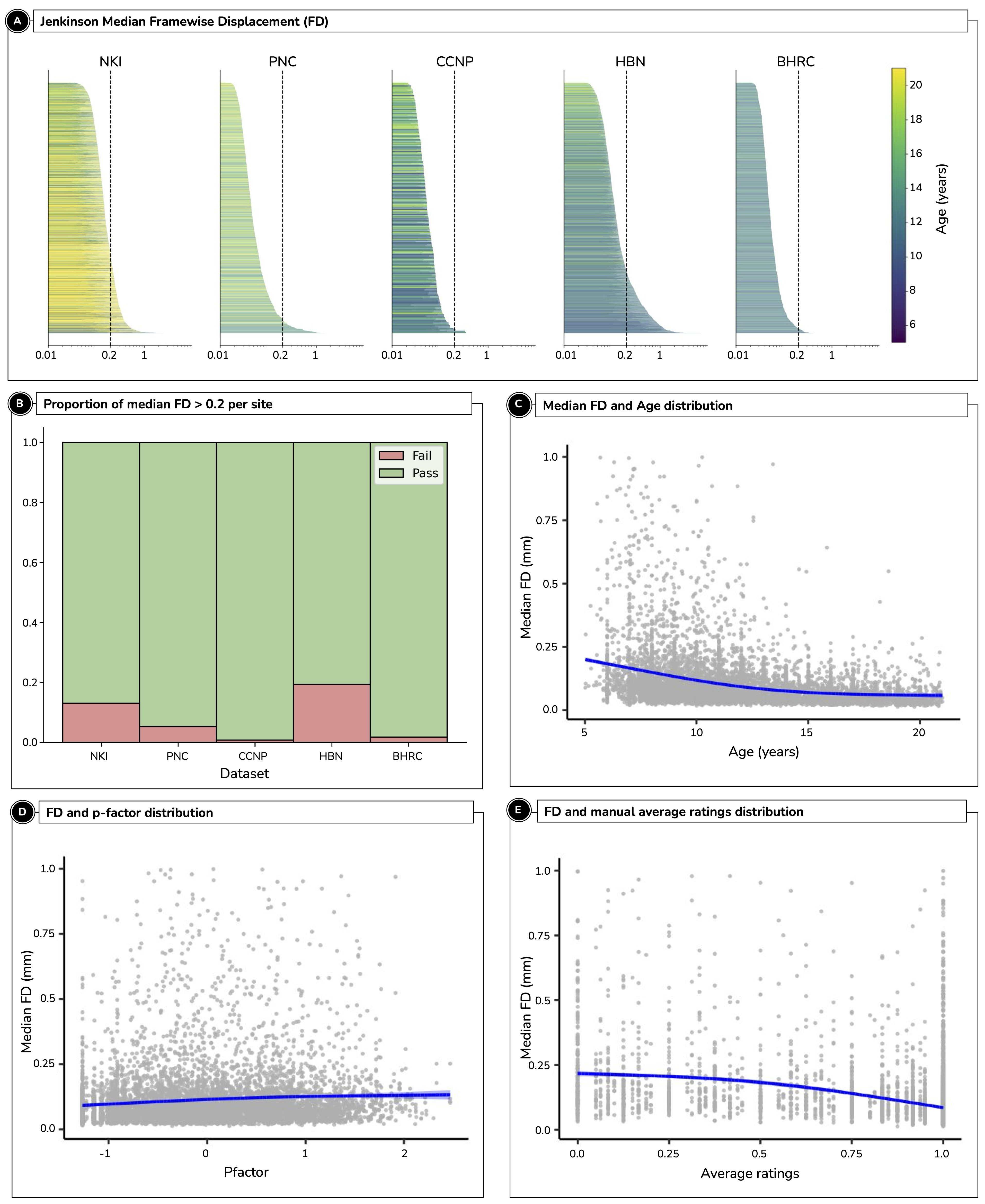 Functional images quality assurance included measures of in-scanner motion (framewise displacement) and normalization quality (correlation of functional image to template image). fMRI runs with a median FD less than or equal to 0.2 and normalized cross correlation greater than or equal to 0.8 were considered of adequate quality. We provide FD, normalization quality, and many other quality metrics for all scans.